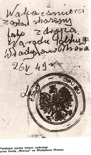 Jesienią 1946 roku (...) wziąłem udział w napadzie we wsi leżącej w powiecie myślenickim. U kilku gospodarzy zabraliśmy wówczas osiem par koni i cztery wozy. Konie kradliśmy też na terenie Czechosłowacji. W oświadczeniu tym,,Orzeł" nie przyznał się natomiast do kradzieży koni dokonanej w jego rodzinnej wsi Jachówce u sześciu rolników w nocy z 13 na 14 grudnia 1946 roku. Dodać tu należy, że rolnicy, którym skradziono konie, nie prowadzili żadnej działalności politycznej.